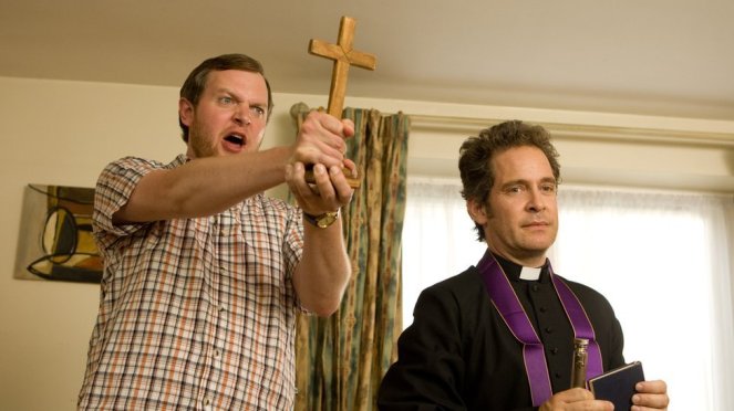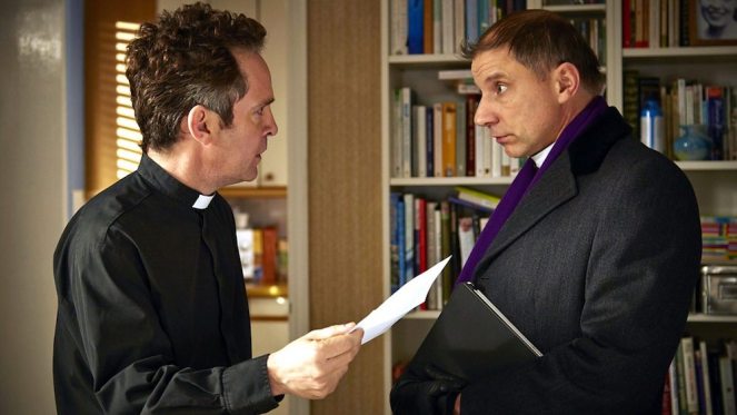 Since this is the Church of England, Adam has to answer to a whole hierarchy of bigwigs, mainly Robert the Archdeacon, who Adam calls the Dark Lord, although not to his face. The Archdeacon puts constant pressure on Adam to increase the congregation and raise money for the church. The fundraising is endless and there’s always something that needs fixing, like broken windows or a leaky roof. Watch clip.