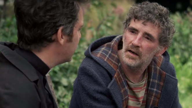 The church has several regular parishioners: Colin is an alcoholic lost soul who is devoted to Adam and the church, and helps or hinders Adam depending on his state of mind. He turns up at the vicarage whenever he likes, helps himself to food, and even sleeps on the couch. Adam and Colin often sit on a bench outside the church to smoke and chat about life and God and stuff. Watch clip.