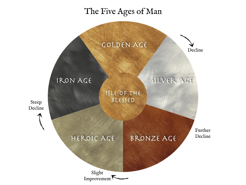 Hesiod described these Ages as the Five Races. The Golden Race were the gods, ruled by Kronos who was overthrown by Zeus as ruler of the Silver Race. Zeus got fed up with the disobedience of that race and replaced it with the Bronze Race, who went on to destroy themselves with warfare. The Race of Heroes and demi-gods was a slight improvement, but the inevitable decline returned with the Iron Race.