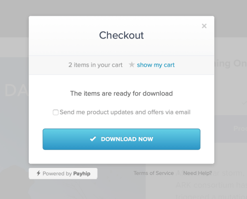 You can remove items if you want to, or click ‘Back’ to return to the Checkout screen, enter your email and pay. DON’T CLICK AWAY or close the screen at this point because there’s one more step that shows your items are ready for download: