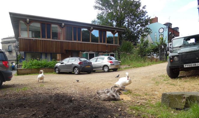 “…to the scrap metal yard hidden behind the old flour mill, now called The Cluny and home to artists and creative types. To the left was the huge brick chimney of the old forge, and behind that, the farm with its grass roof and solar panels, and beyond to the three bridges: brick, iron and concrete. The whole area was an evolving time capsule, an oasis of animals and art in the centre of town.”
