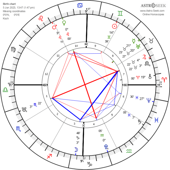 The Venus Pluto opposition is in an 8-degree orb from 28th May to 14th June, while the square to Jupiter is in an 8-degree orb from 31st May to 24th June. Here’s the configuration on the day that Venus enters Leo – you can see that Mars is no longer opposite Pluto but he is square Jupiter and the nodes: