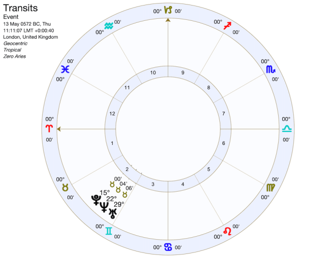 So to begin this exploration we need to go back to the start of the long cycle between Uranus, Neptune and Pluto. This is the conjunction of all three planets that happened in the 6th century BCE, sometimes known as the Axial Age. There were actually three conjunctions in Taurus between each of the pairs spread over several years from 579 to 572 BCE.