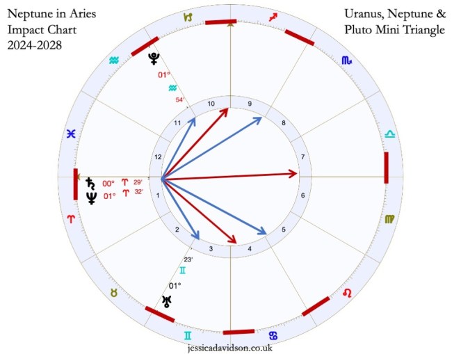 How this influences your chart depends on where your natal placements are, as well as the orb you use for transits. The closest triangle alignments are in Aquarius, Aries and Gemini, but it’s also in orb when Uranus is still at the end of Taurus and Neptune is at the end of Pisces in 2024–25.