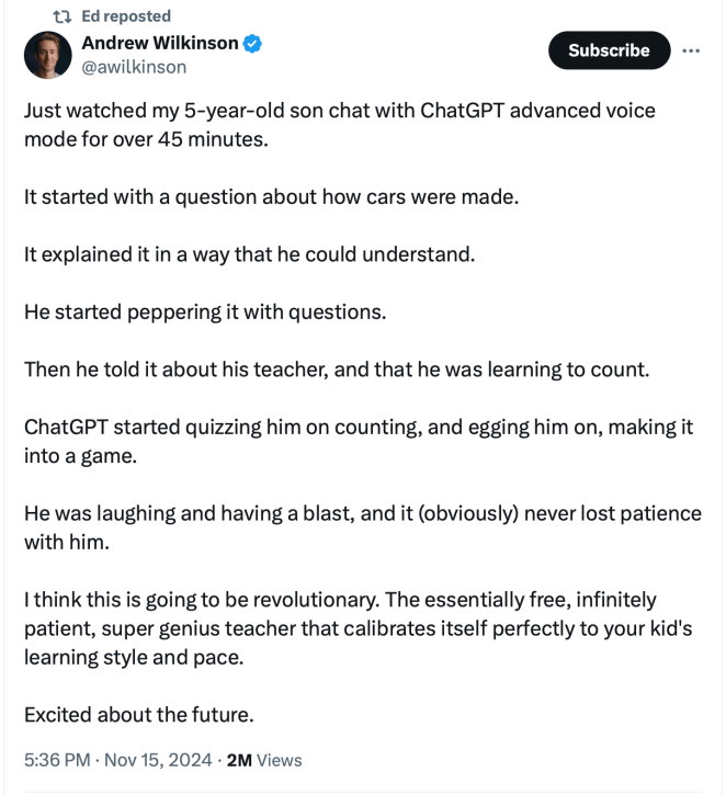 For example, I came across this tweet from Andrew Wilkinson about his 5-year-old son using ChatGPT to learn and what a great experience it was for him. The AI encouraged him and made learning fun – why can’t teachers do this? – and as he says, it never loses patience: