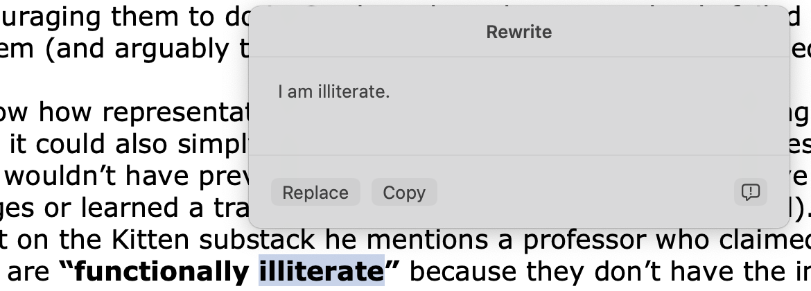 The rewrite doesn’t improve the selected text because there was nothing wrong with it to begin with. It just swops out a few words. I also got it to rewrite just the word ‘illiterate’ and it finally admitted the truth!
