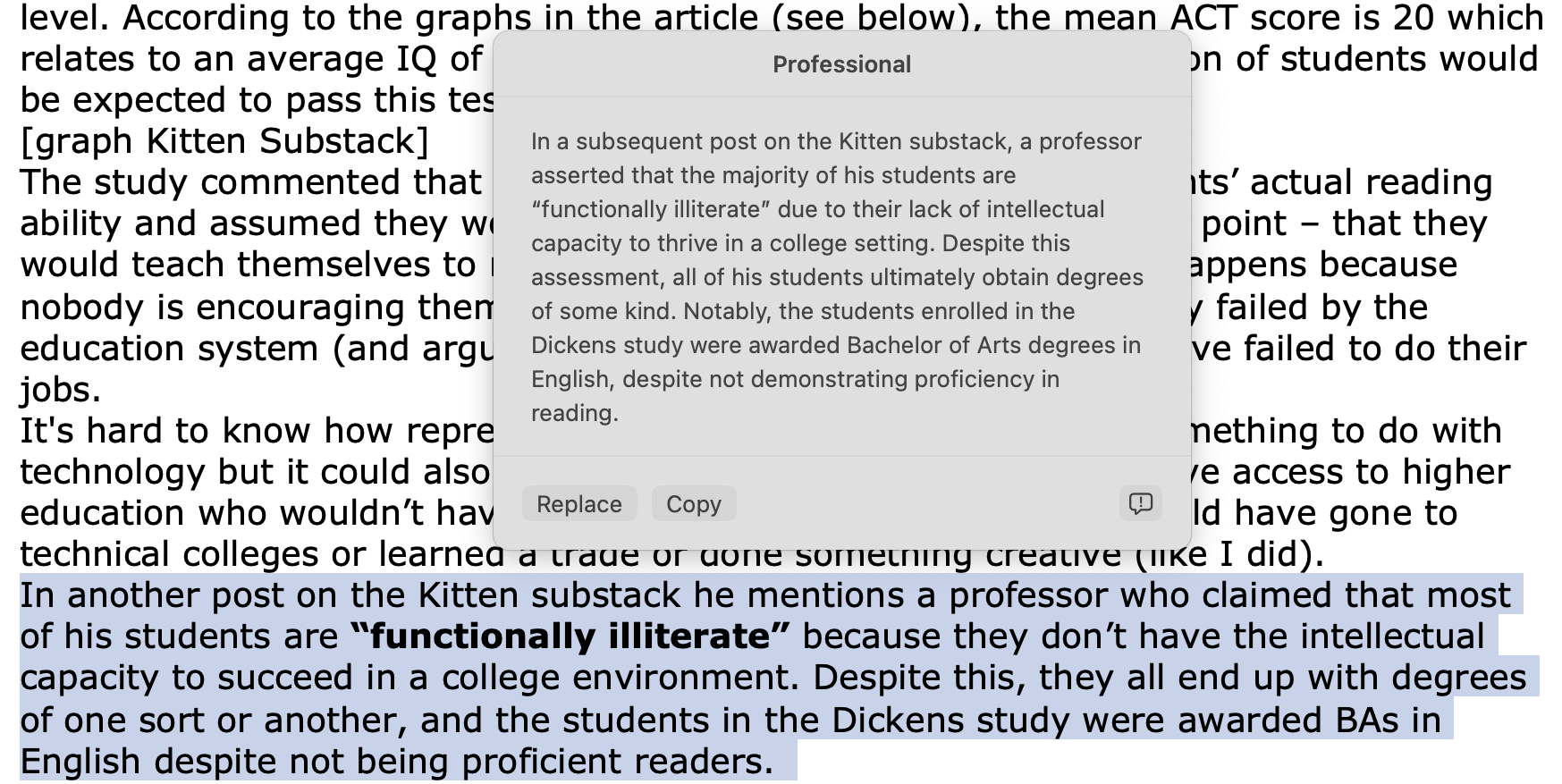It seems to want you to soften what’s being said, make it less frank, less direct, as if it doesn’t want to be too critical in case it hurts somebody’s feelings. It ends up pulling its punches and being evasive. But it’s not really censorship. It will happily rewrite the ‘problematic’ words and use them in its rewrite. It didn’t like the phrase ‘functionally illiterate’ but rewrote that paragraph and used that phrase (click to read):