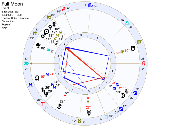 The Full Moon on 3rd January is in Cancer conjunct Jupiter opposite the stellium of planets in Capricorn. This is great for getting stuff done, bringing projects to completion, or getting organised and deciding how you want to spend the rest of the year. Just make sure your feelings don’t get carried away with themselves.