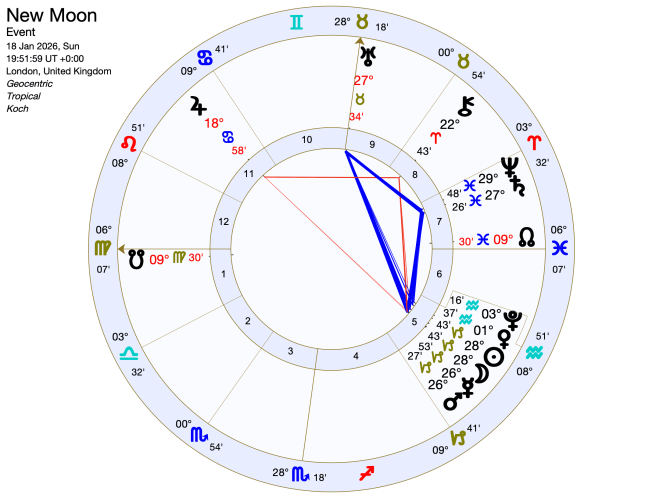 By the middle of the month there are 6 planets in Capricorn when the Moon enters the sign on 16th. The stellium now starts to conjunct Pluto in Aquarius, adding intensity to everything you do. Venus is the first to reach Aquarius on 17th January, just before the New Moon in Capricorn on 18th which is conjunct Pluto, sextile Saturn Neptune, and trine Uranus.