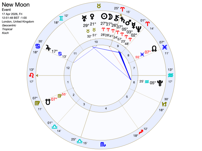On 17th April the New Moon in Aries packs a lot of energy into one small area with 2 stelliums. Mercury, Mars, Saturn and Neptune are tightly packed in the first decan, while the lunation is at the end of the sign conjunct Chiron and square Pluto. This lunation is about taking independent action to achieve your goals and could provide a powerful new beginning in this area of your chart.