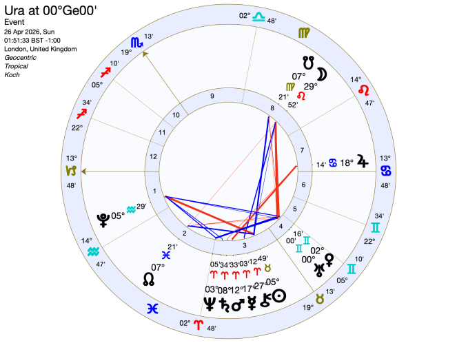 - 24 Apr – Venus conjunct Uranus at 29° Taurus