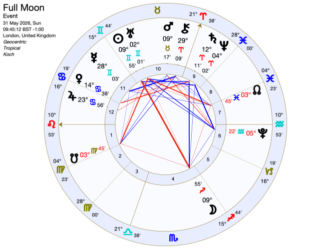On 31st May the Full Moon in Sagittarius continues the potential for disruption with the Sun conjunct Uranus and the Moon opposite. The Moon also trines Saturn and Neptune and sextiles Pluto, while the Sun sextiles Saturn and Neptune and trines Pluto. This is a restless lunation with a strong need for communication and freedom and you may want to experiment or go on an adventure.
