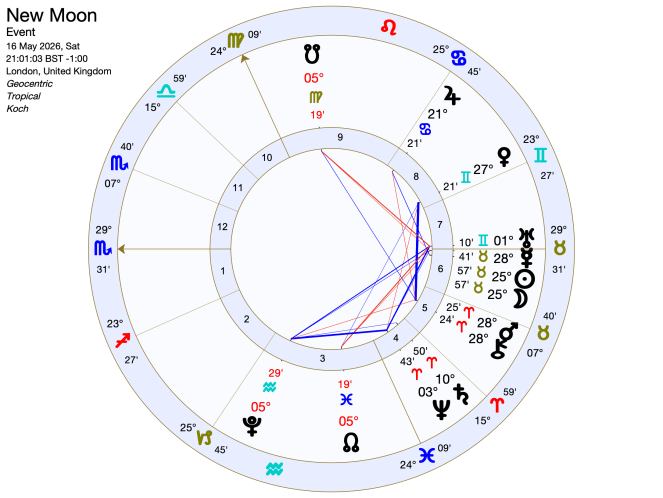 On 16th May the New Moon in Taurus is conjunct Mercury in Taurus and Uranus in Gemini, and sextile Jupiter. Mercury is also sextile Neptune and trine Pluto, and the Mars Pluto square is starting to build. This lunation focuses on your need for stability and dealing with practical matters but you can expect Uranus to disrupt your plans.
