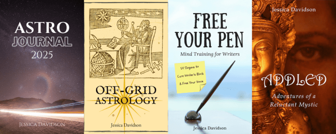 I’ve written two visionary fiction novels, a mind training guide for writers, and a bunch of astrology books. They’re available on Kindle and in paperback from Amazon, and at Payhip. Details on my Books page.